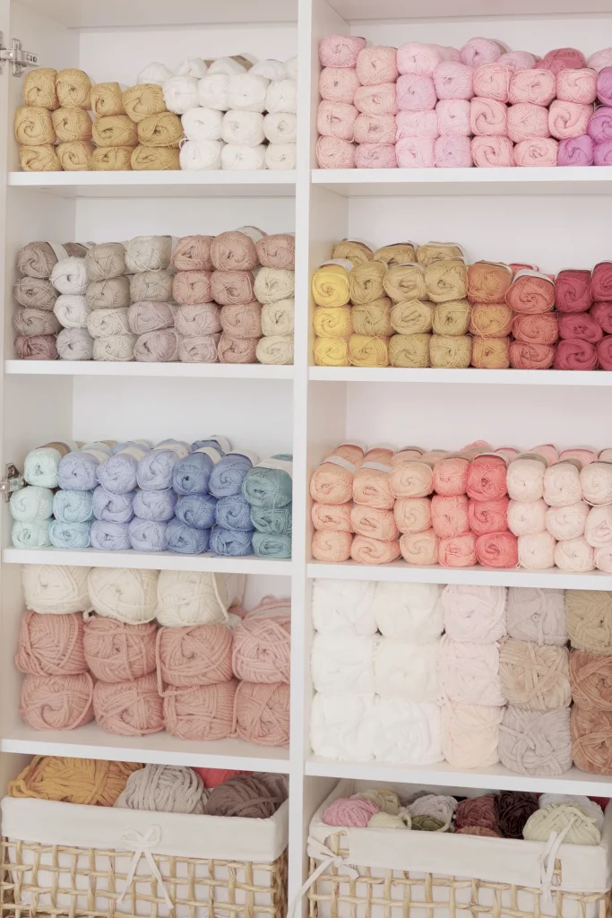 - 100% Cotton: It’s “stiff” and smooth, making it very easy to see your stitches. Perfect for amigurumi and summer accessories. My recommended brands: Scheepjes Catona, Schachenmayr Catania.