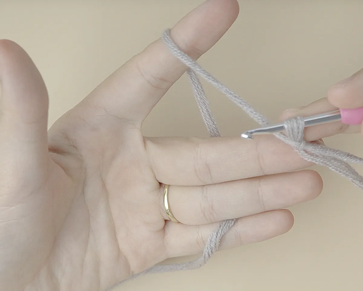 2. Bring the yarn over your index finger. If you’re a beginner and the yarn feels too slippery, wrap it around your index finger once more.