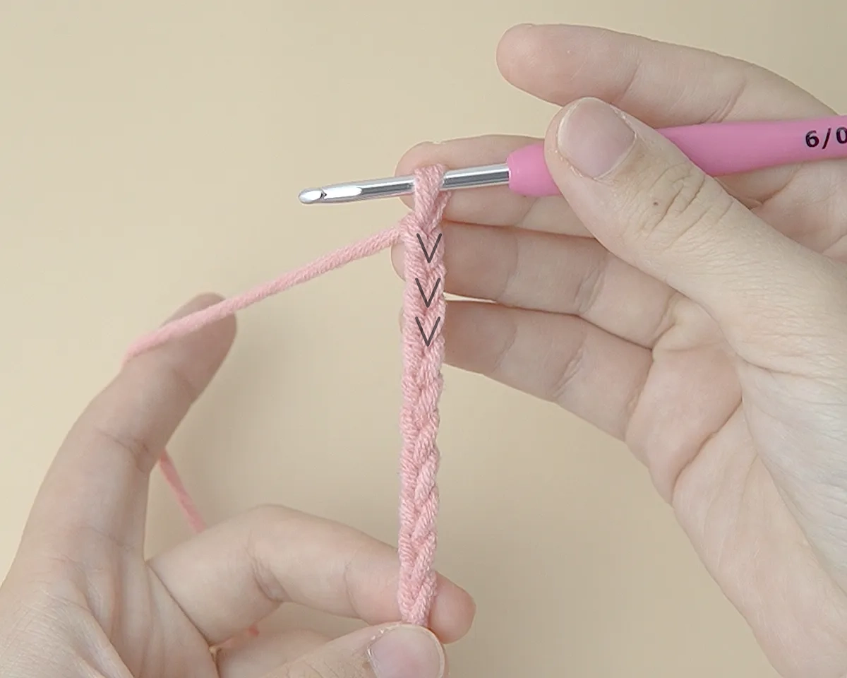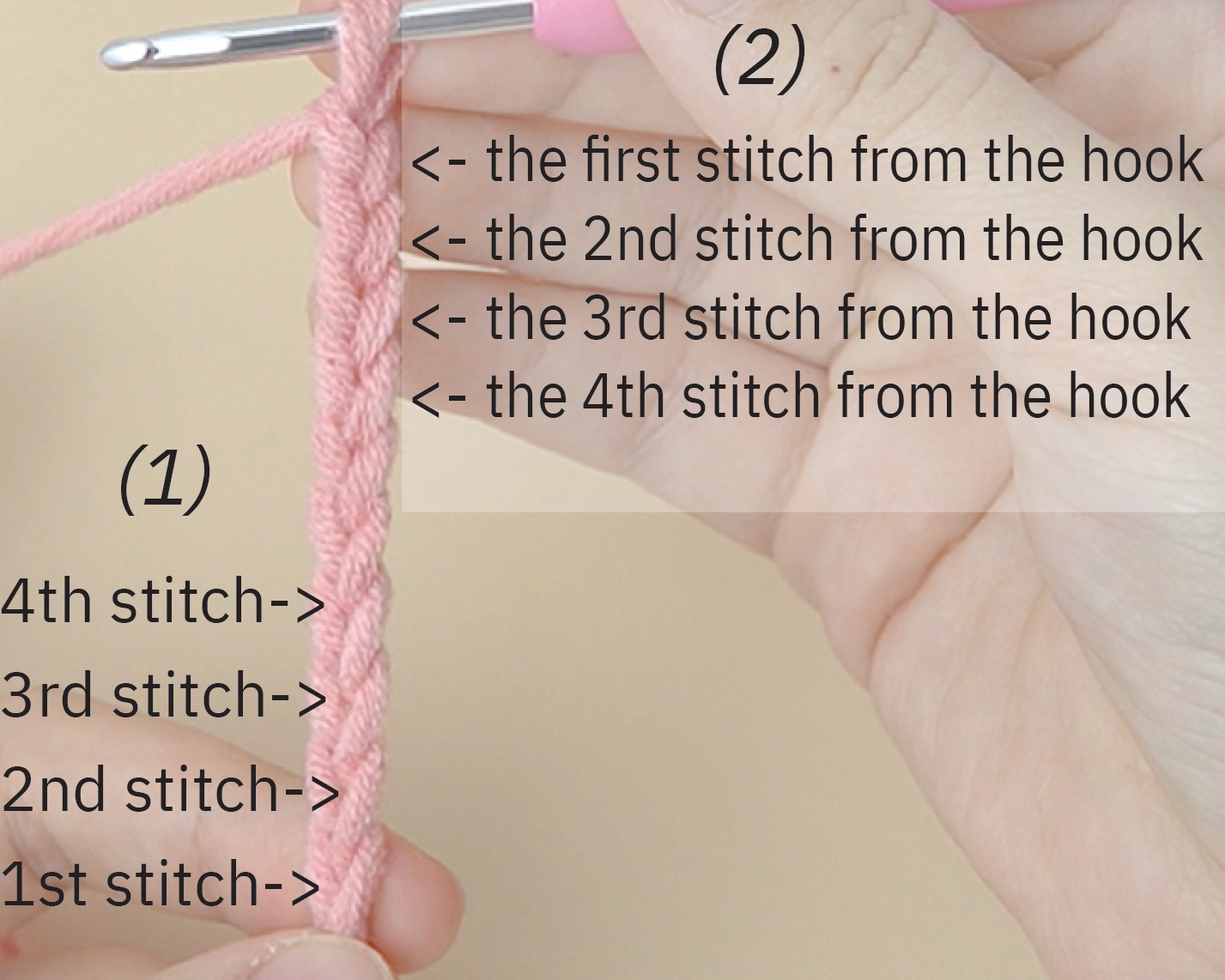 From the Front: Each chain looks like a “V” shape, and each “V” is counted as one stitch. Every “V” consists of two parts: a left loop and a right loop.