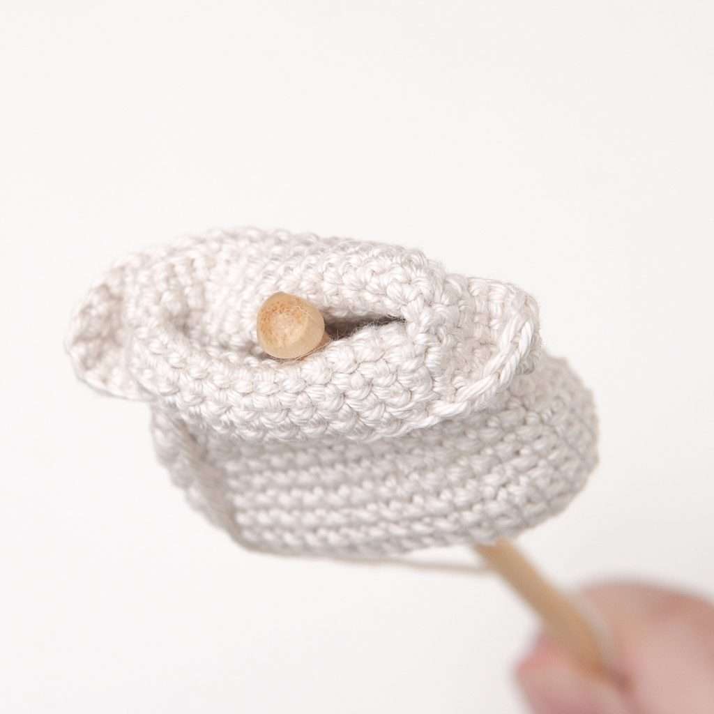 Fasten off and leave a long tail. Use a sewing needle, weave the yarn tail through the front loops of the last round and pull it tight to close the hole, sew the yarn tail through the button 2 or 3 times, then weave the yarn tail. Glue the mannequin on top of the wooden coaster. (Pic.7-9)
