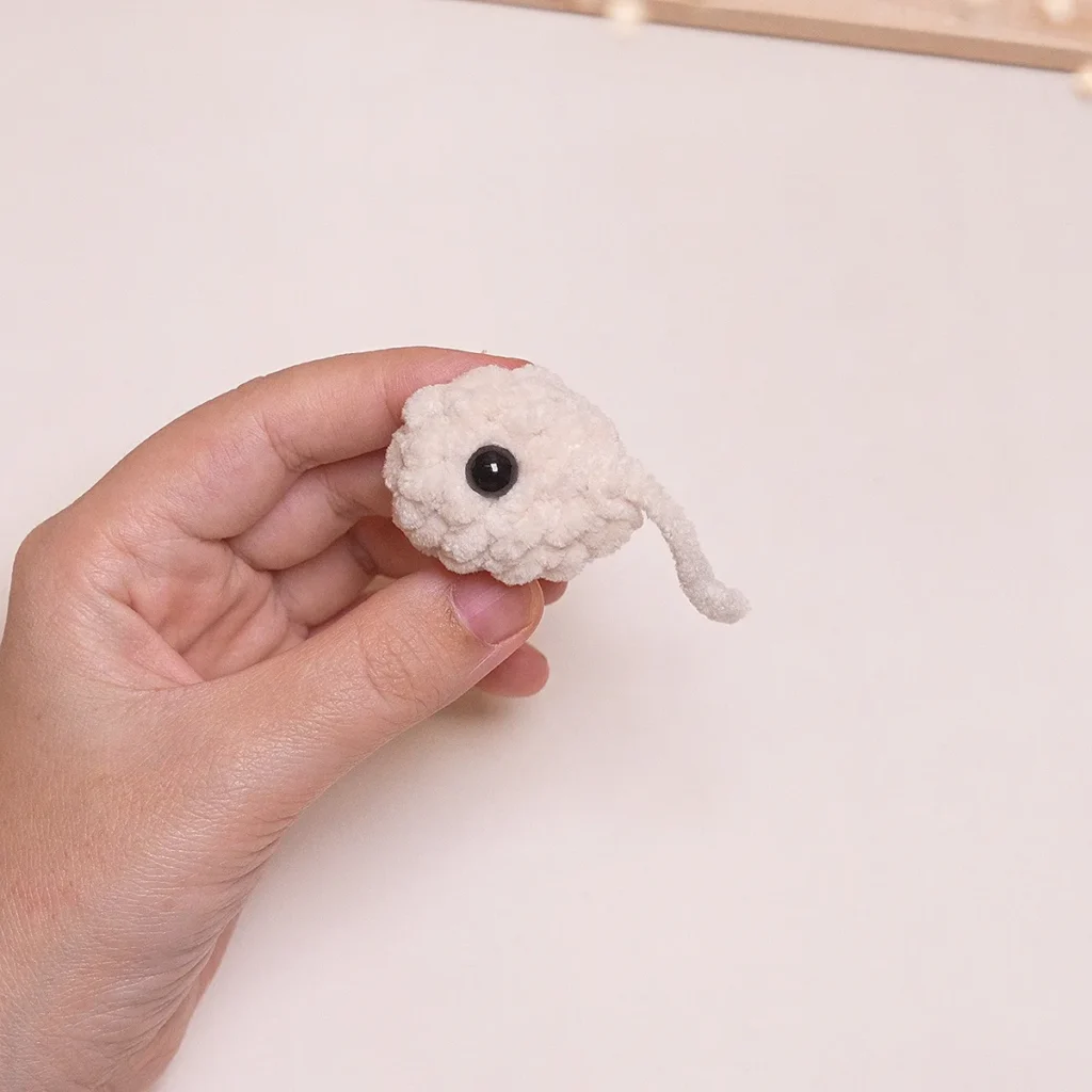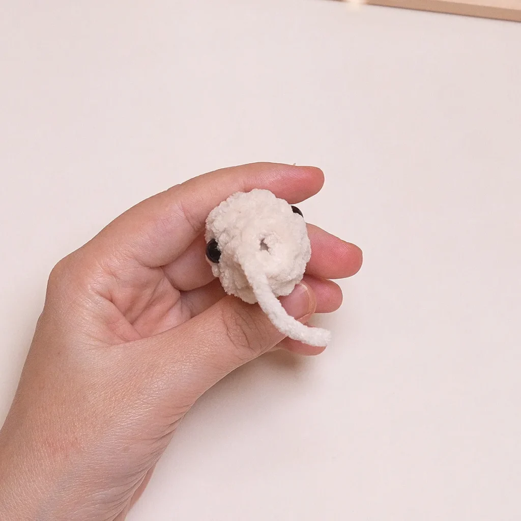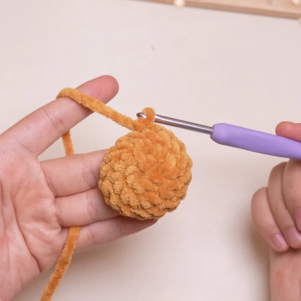 – Tail: slst in to the front loop of the 1st stitch of Rnd 2, chain 2, start to crochet into the second chain from the hook: 1 sc, slst into the same front loop of the first stitch of Rnd 2. Continue to crochet through both loops: 1 sc.
