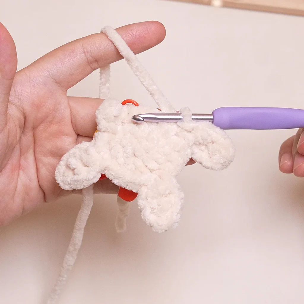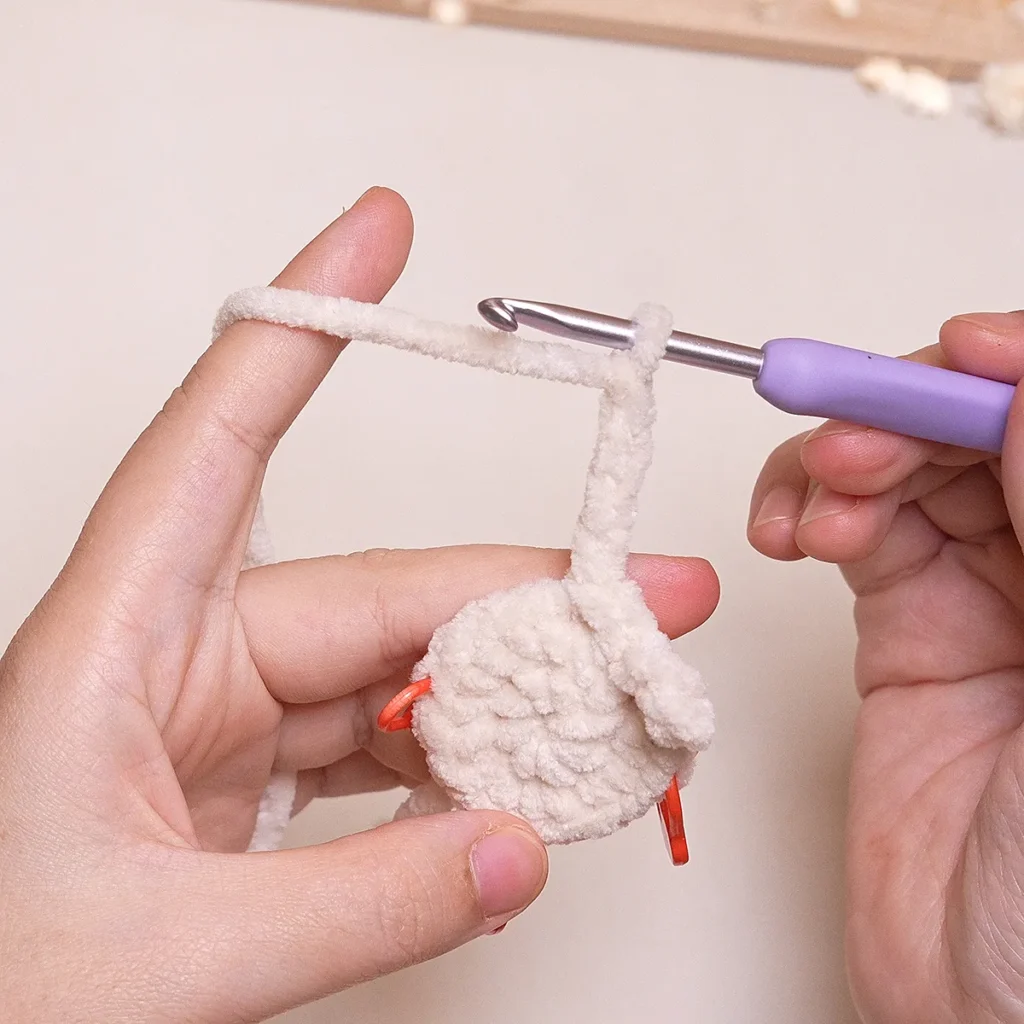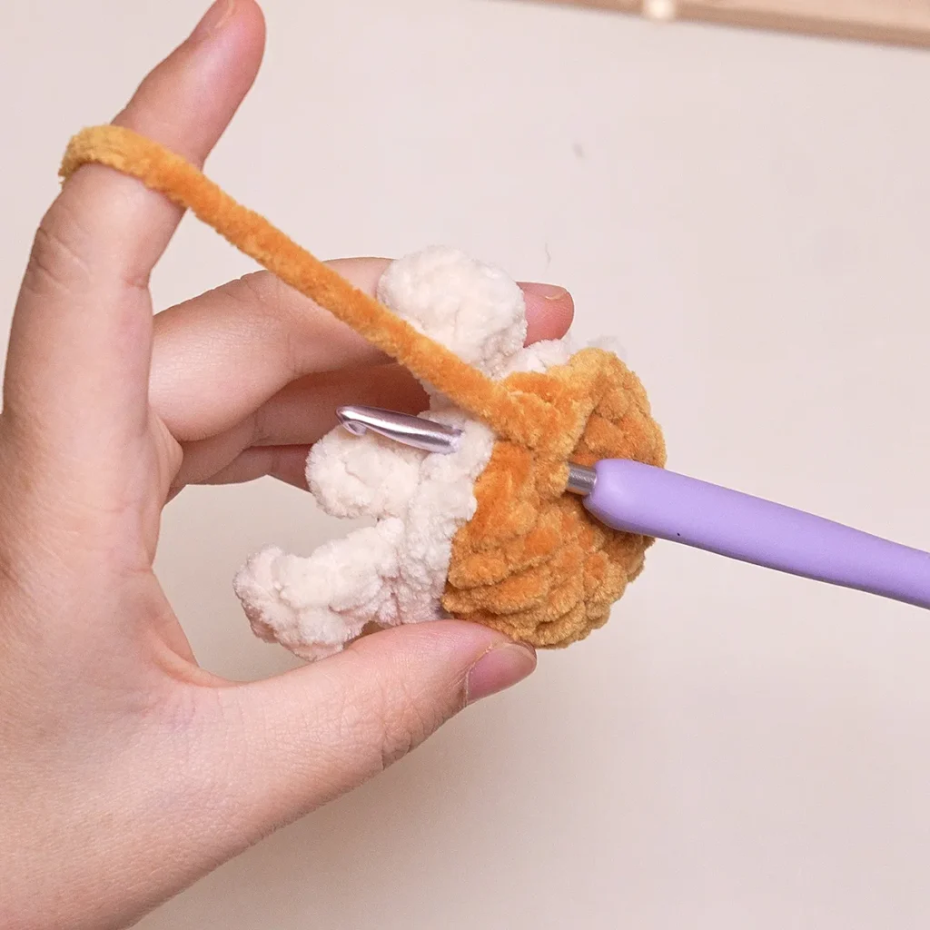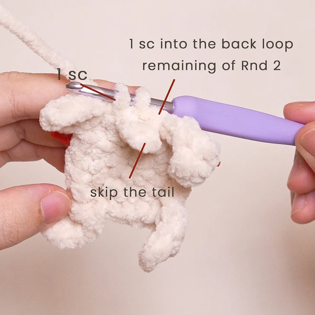 – Skip the tail, 1 sc into the back loop remaining of Rnd 2, then crochet 1 sc.