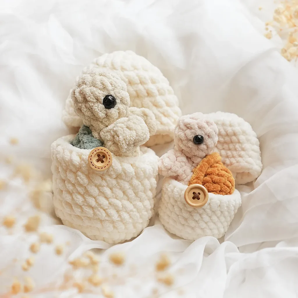The pattern can be customized with different yarn weights to create smaller or larger turtles.